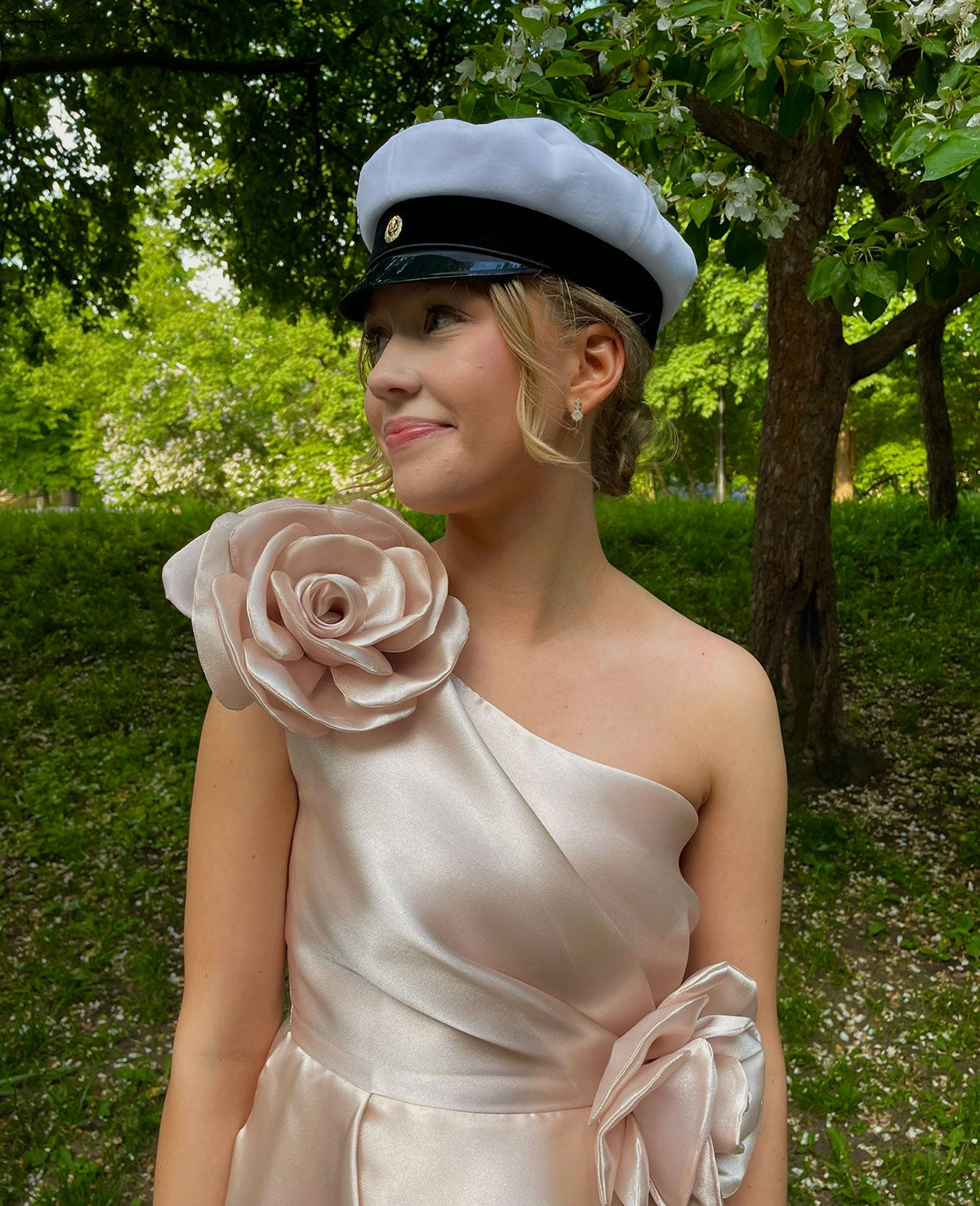 Siiri lõpukleidiks Helsinkis asuva Prantsuse-Soome kooli lõpetamiseks sai eritellimusel valminud shampanjavärvi asümmeetrilise lõikega kleit Walking Flower kollektsioonist, mida ehivad kaks käsitsivalmistatud lilleõit.