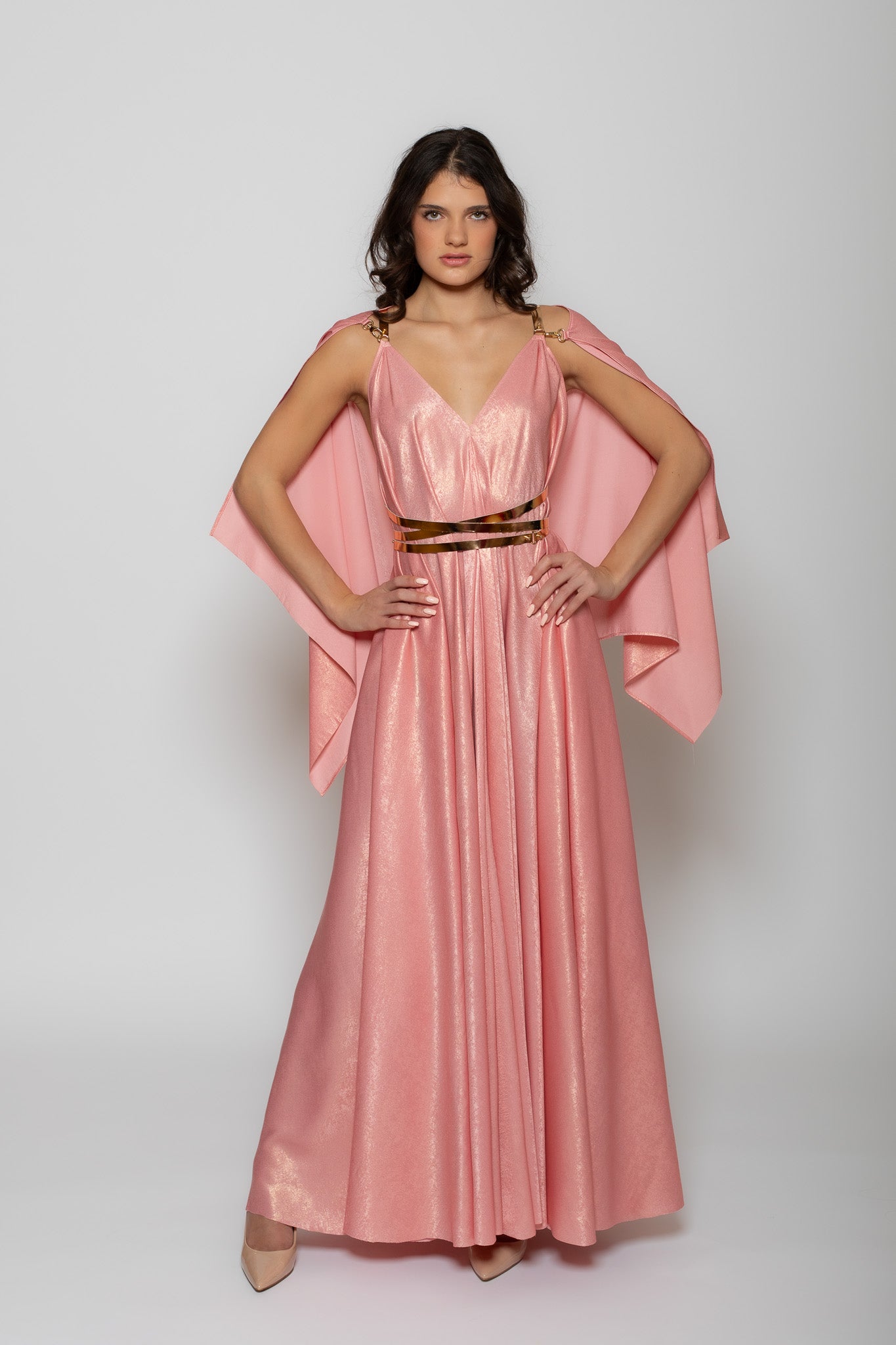 Roosa sall, mis on mõeldud kandmiseks pildiloleva kleidiga. Sall kinnitub kleidi külge kuldsete karabiinidega.