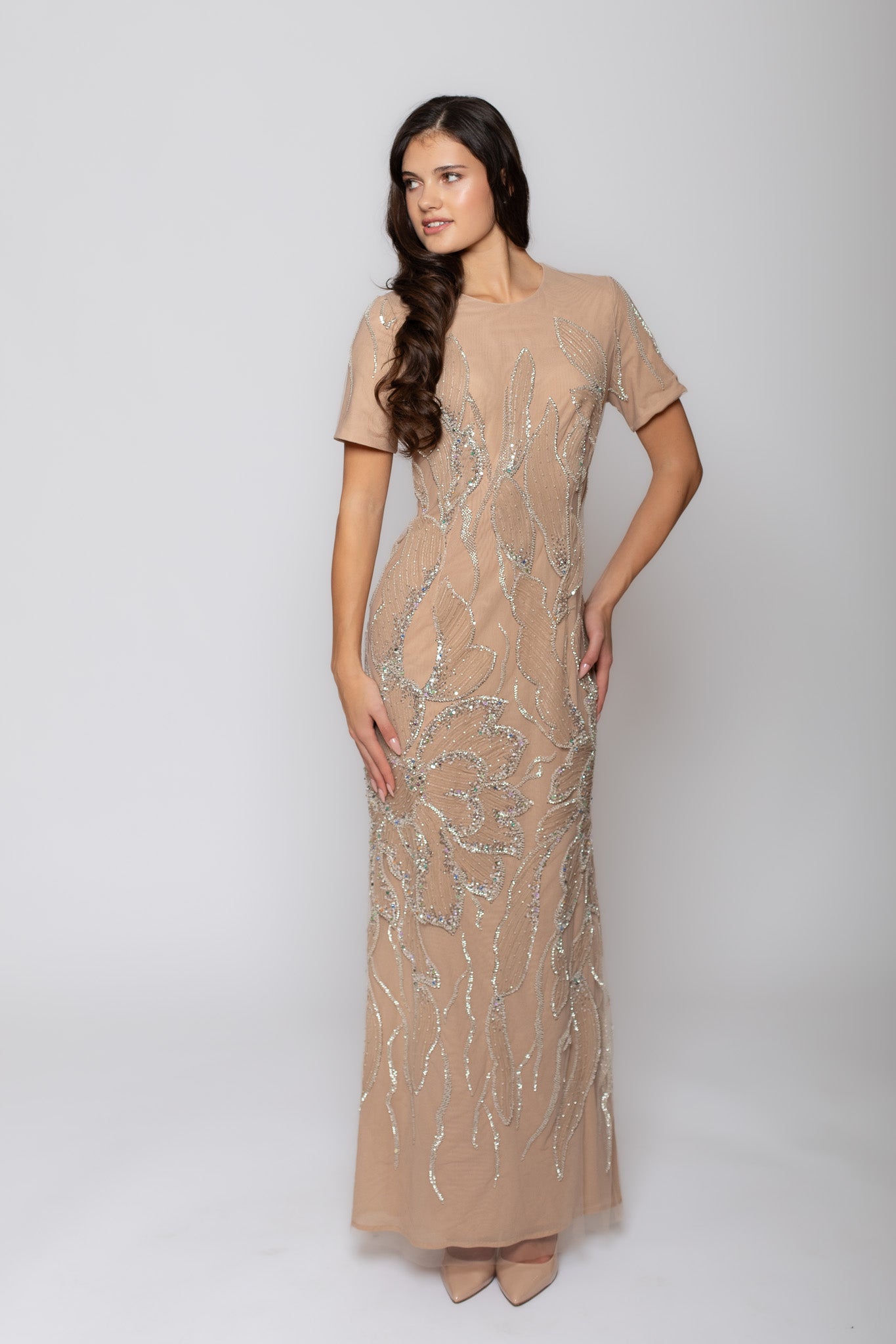 Beež õhtukleit hõbedaselt sädelevate lillemotiividega ja väikeste varrukatega. Kleidil on mugav nailonist võrkvooder ning seljal peitlukk.