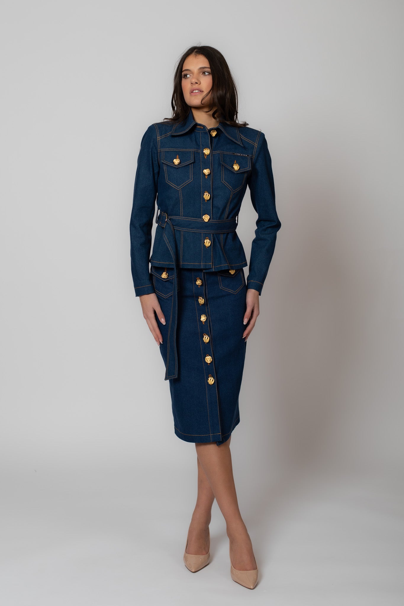 Efektsete kuldsete nööpidega mitmekülgselt kombineeritav sinine teksaseelik, mis sobib hästi kokku meie Denim kollektsiooni teksajakkidega ning särkide, pluuside ja kampsunitega olemasolevas garderoobis.
