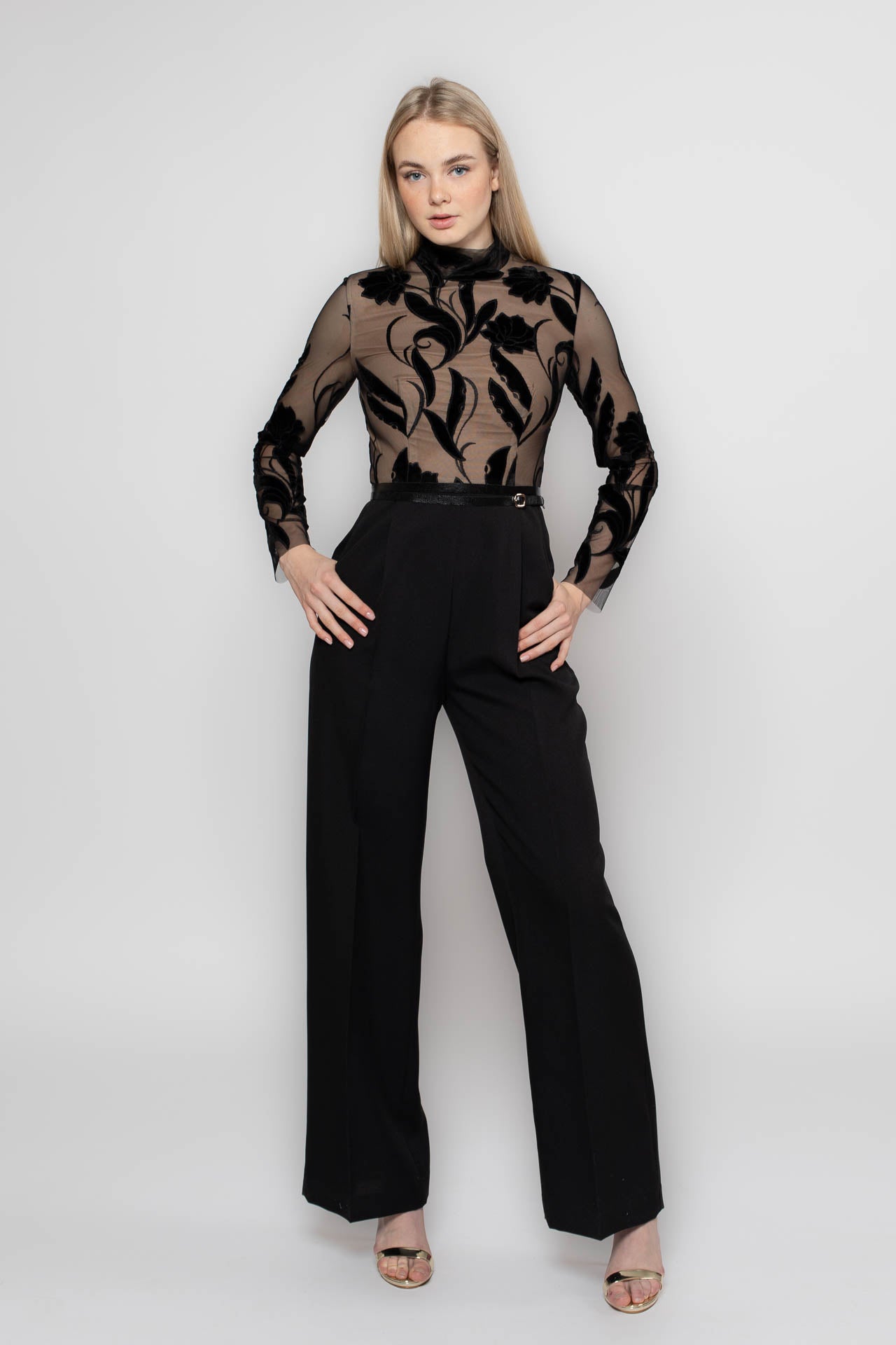 Sametiste lilledega elegantne must jumpsuit sügistalviseks hooajaks. Pükstükil on ka taskud, seljal on peitlukk.