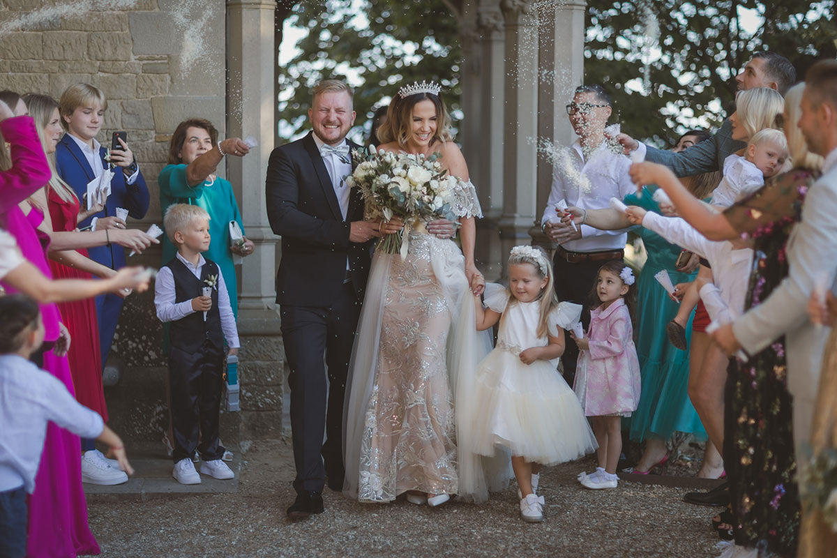 Peale pulmatseremooniat ootasid noorpaari kabeli ukse ees juubeldavad pulmalised, kostitades vastabiellunuid sümboolse riisisajuga. Tegu on vana Itaalia pulmatraditsiooniga, mis sümboliseerib küllust ja viljakust.