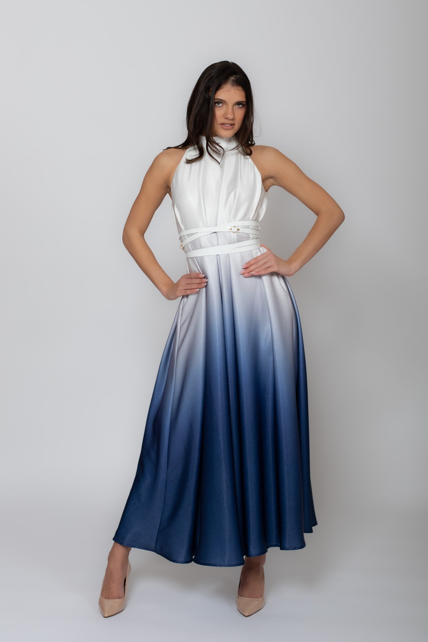 Valge-sinine midipikkuses kleit tähtpäevadeks ja sündmusteks kevadsuvisel või sügistalvisel hooajal. Kleit on universaalsuuruses ja sobib kandjale suuruses 34-40. Kleidi saab taljesse reguleerida valge nahkvööga, see tuleb kleidiga kaasa.