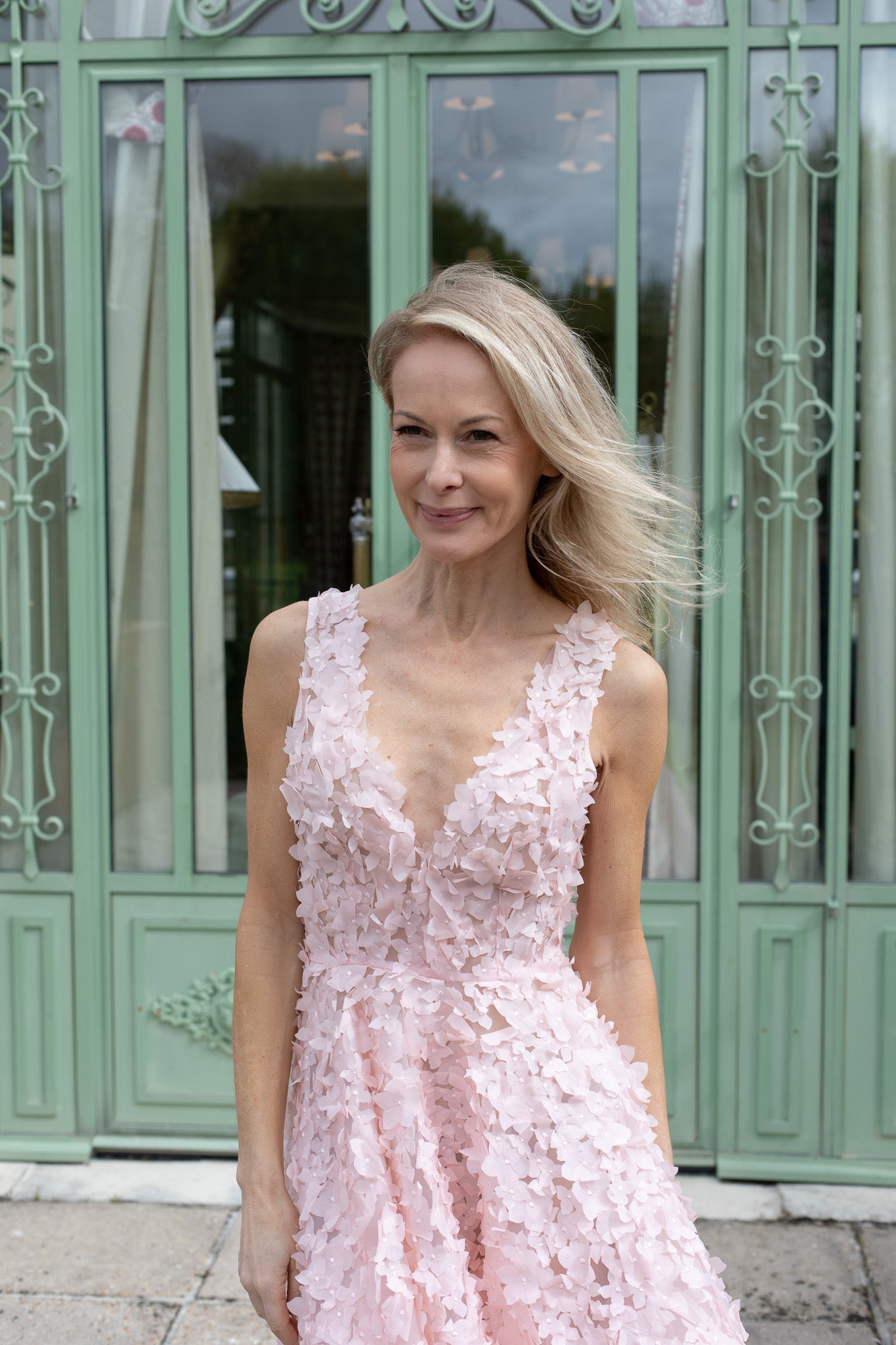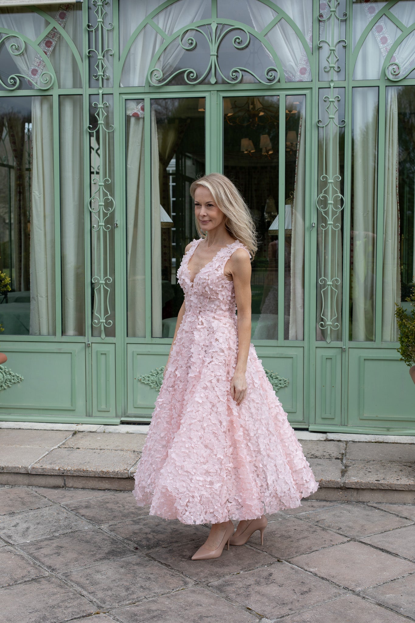 Midipikkuses koheva seeliku ja 3D-lillekestega roosa kleit.