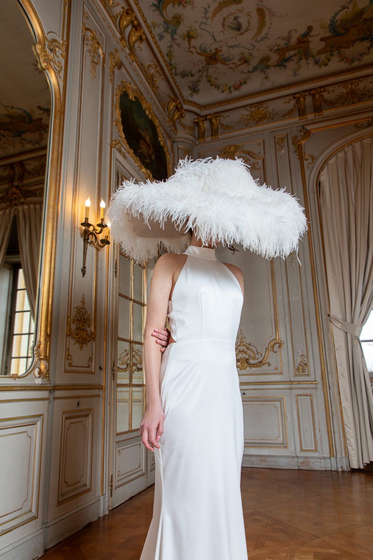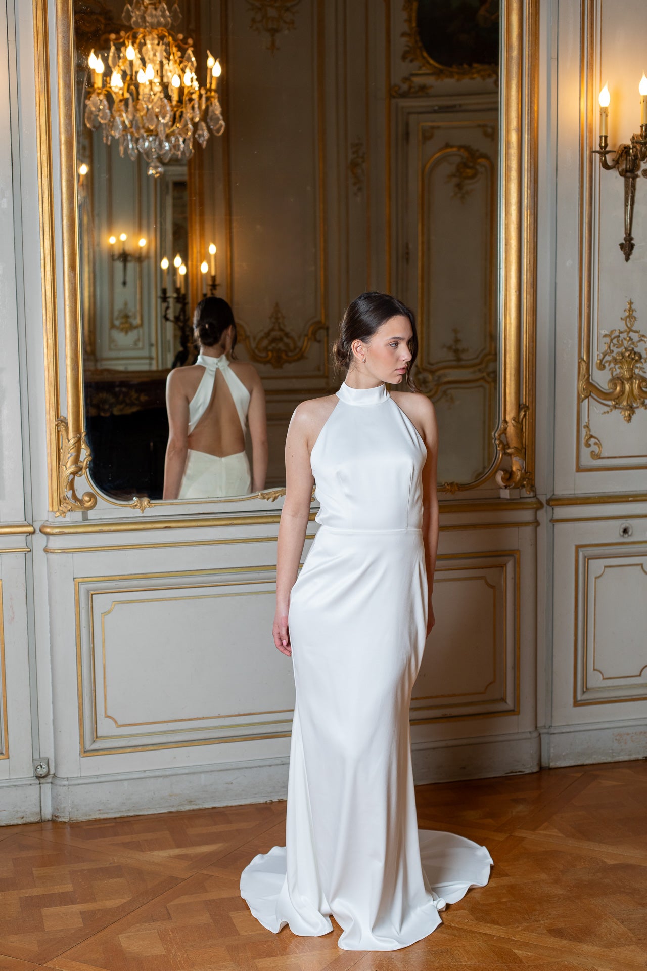 Valgest satiinist avatud selja ja šlepiga pulmakleit klassikalist ilu hindavale pruudile.