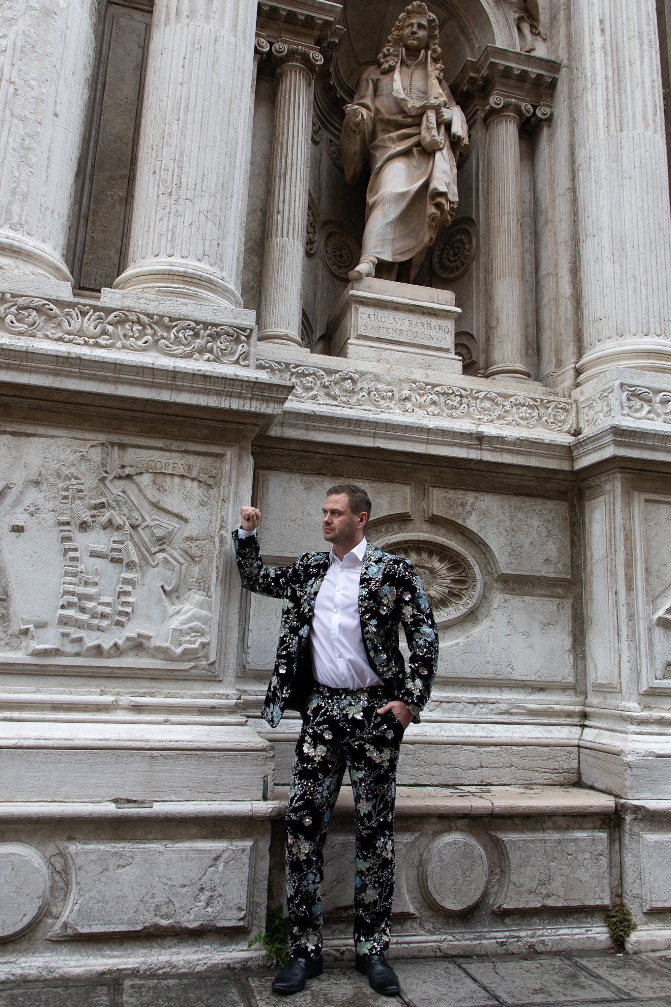 Siniroheliste lillemotiividega sametkangast püksid, mis sobivad kokku samast kangast pintsakuga.
