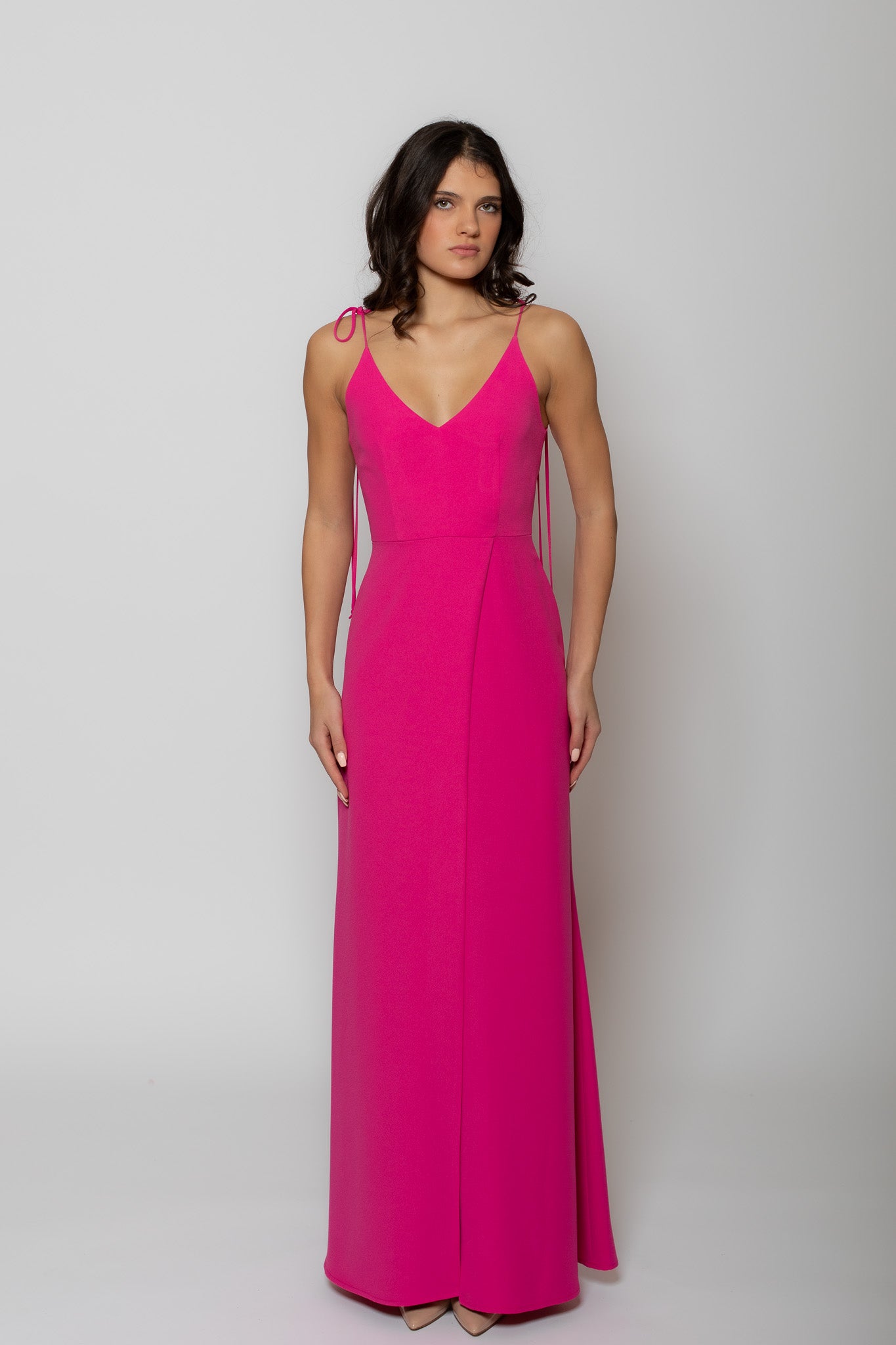 Lihtsa lõikega efektset roosat värvi pikk kleit, mis on tehtud vastupidavast ja vähekortsuvast kreppkangast. Kleidil on peened õlapaelad, seljal on peitlukk.