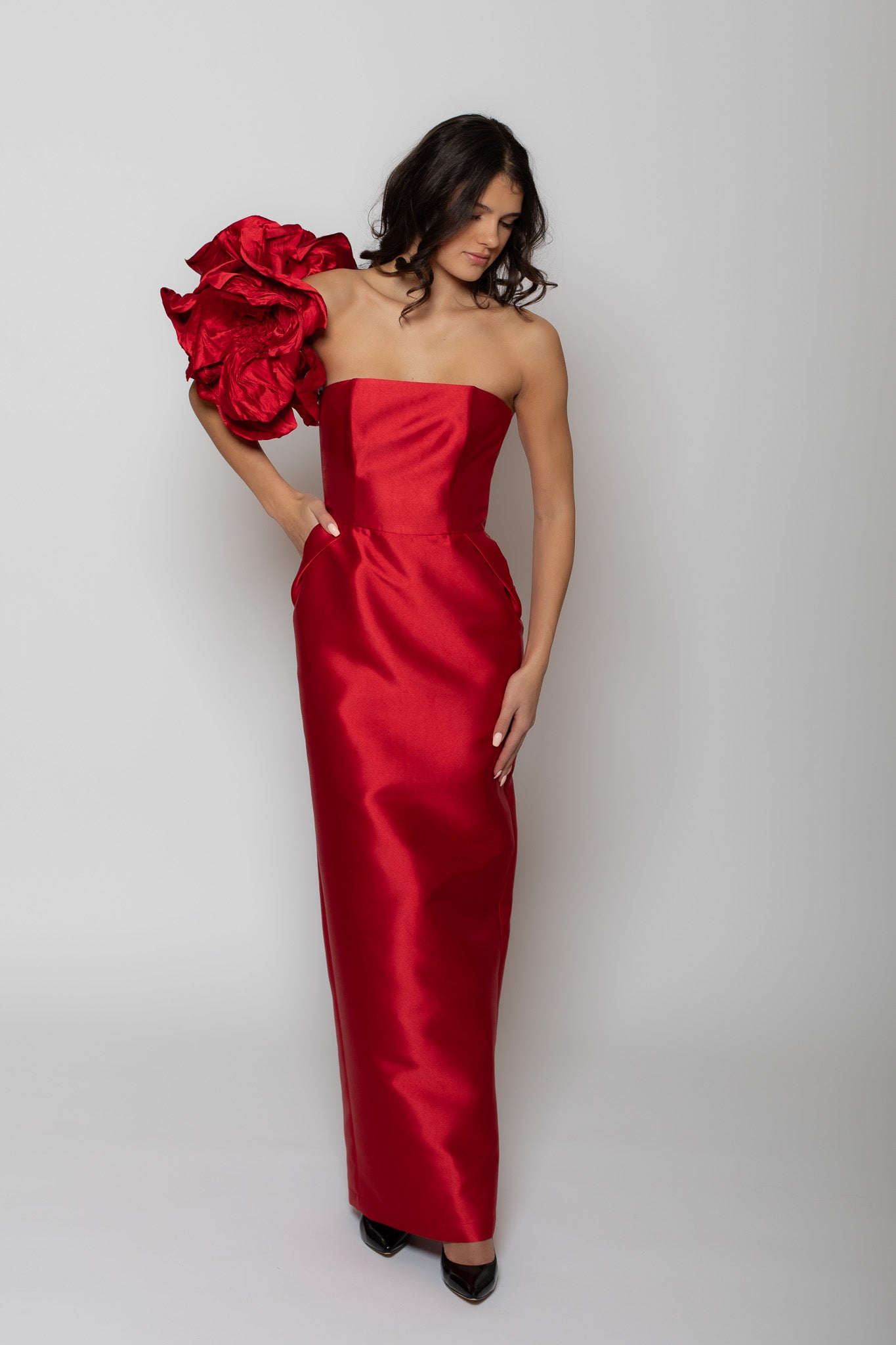 Punane käsitsi valmistatud lilleõitega ehitud korsettkleit, mida saab kanda kahe, ühe või ka täiesti ilma õieta. Lilleõied kinnituvad kummiga ümber käsivarte, muutes stiliseerimise lihtsaks ja mugavaks. Seelikus on lõhik, seljal on peitlukk.