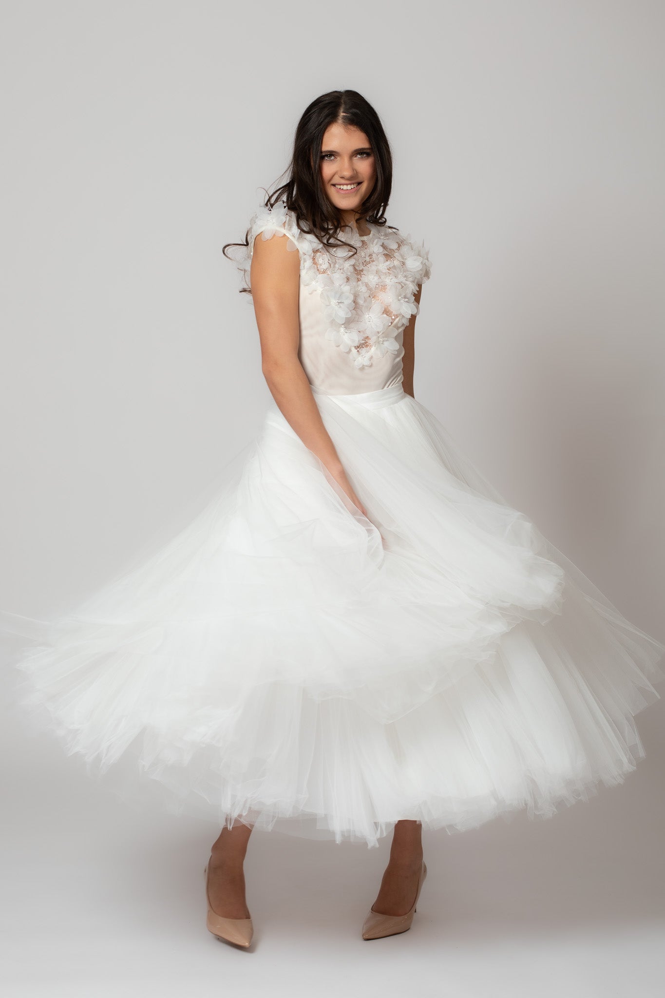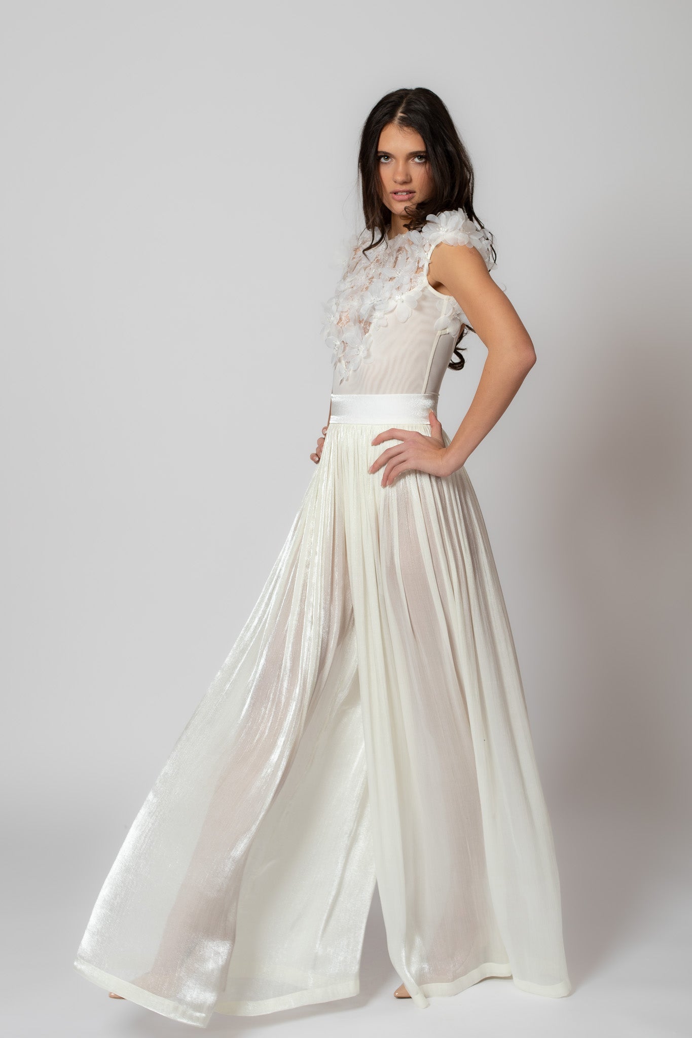 Väikeste varrukatega valge bodi, mis on kaunistatud lillekeste ja pärlitega. Bodil on avatud selg, materjal on veniv ning kandes mugav. Pildilolevad püksipaarid ja seelik on saadaval meie kollektsioonis.